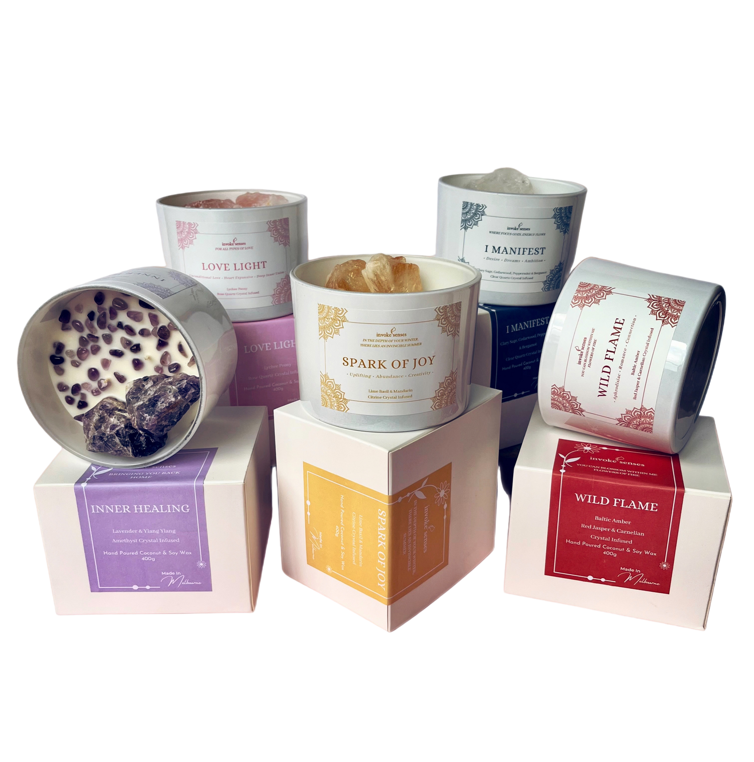 invoke senses specialises in crafting exquisite handmade candles to provide a truly sensory experience. Inspired by the captivating and restorative world of crystals and the soothing essence of botanicals, invoke senses is a haven where the transformative power of nature's treasures comes to life.
